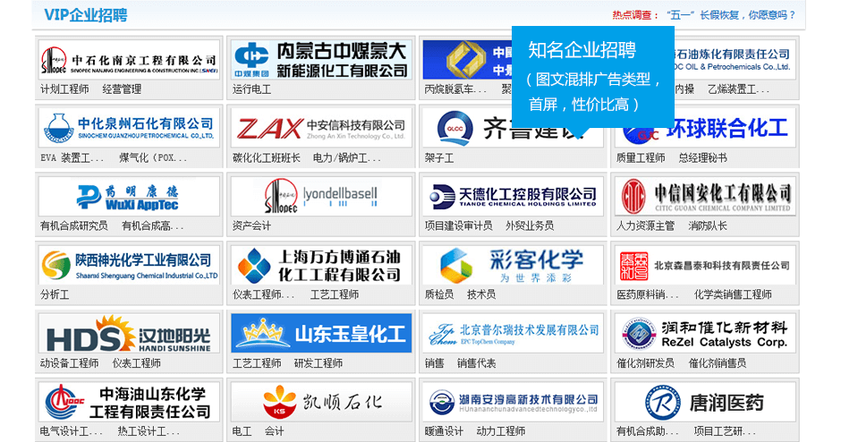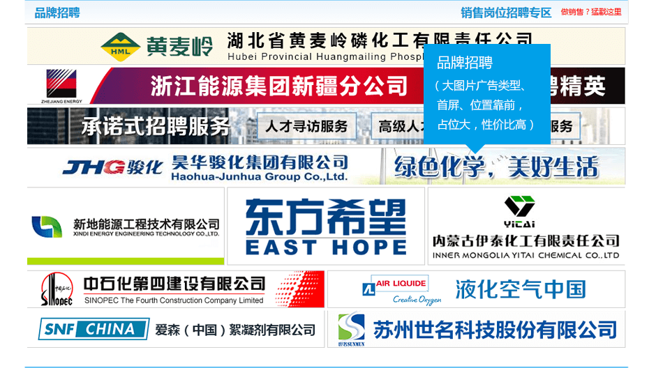 移動(dòng)端品牌招聘、熱點(diǎn)招聘、知名企業(yè)招聘等廣告類(lèi)型,有效提升招職位的關(guān)注度。